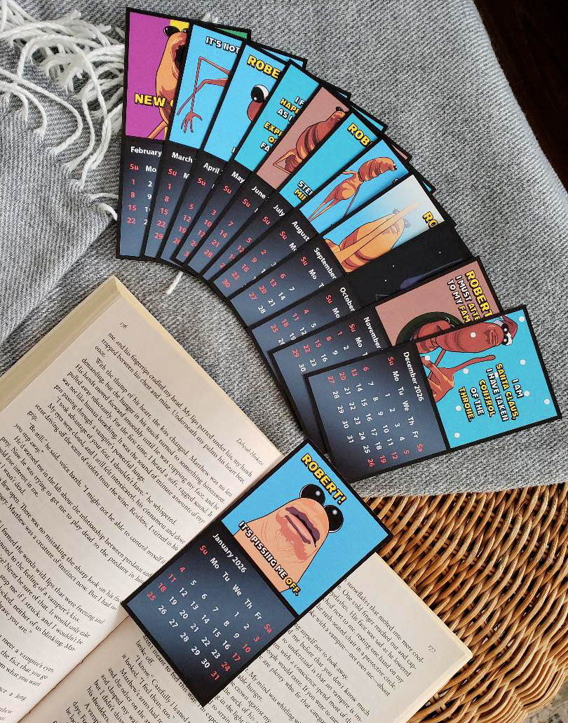 Marcus the Worm Bookmark Calendars – Colour Print, 2.6 x 5 inches each. A set of 12 bookmark monthly calendars to help you keep track of how many books you will read per month and to have a chuckle each time. Free shipping within Canada or USA. Shipping takes 3-5 weeks and shipping options are limited to Canada or USA for now.