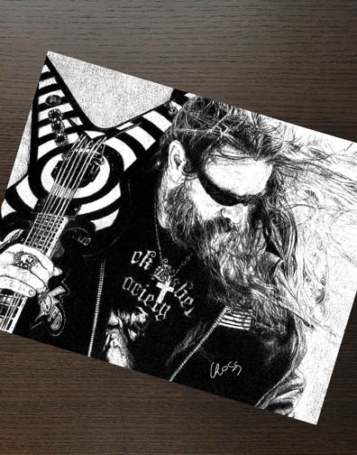 Zakk Wylde – Black Print, 8.5 x 11 inches. Free shipping within Canada or USA. Shipping takes 3-5 weeks and shipping options are limited to Canada or USA for now.